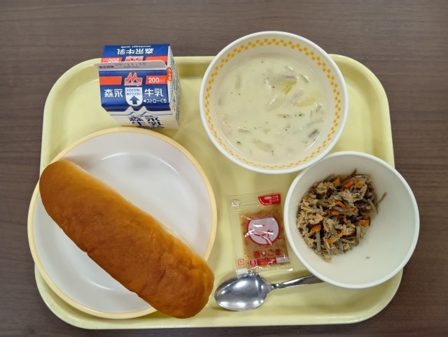 献立は、おいものポタージュ、ごぼうサラダ、ごまドレッシング、ハニーパン、牛乳 です。