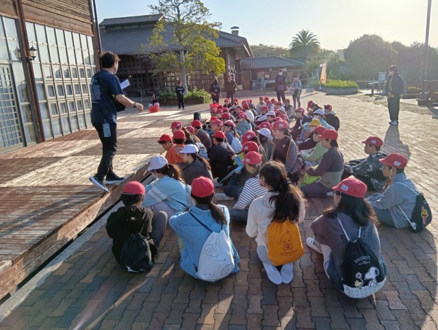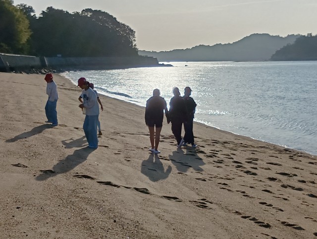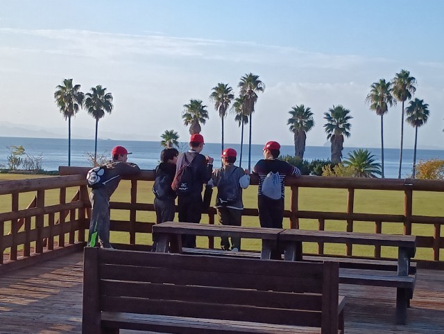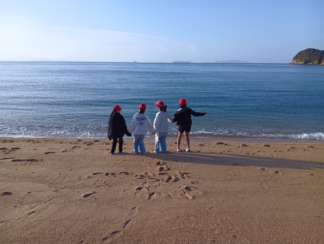 集合場所に一番に来た子たちは、しばし海辺の絶景を味わいました。みんながそろったら宿舎の方の説明を聞いて、グループ別に分かれます。