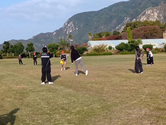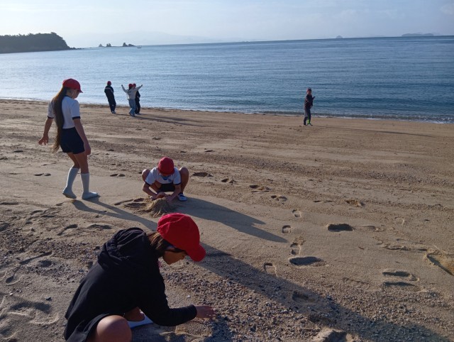 アクティビティの一つは、芝生と浜遊びです。貝殻を拾ったり、飛び跳ねる魚を見つけたりして楽しみました。芝生では、ボールで遊びました。