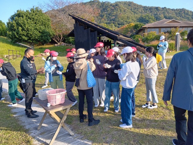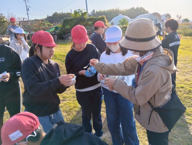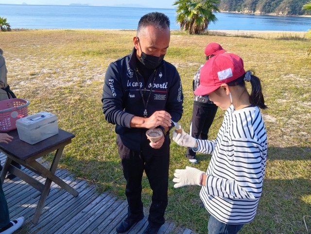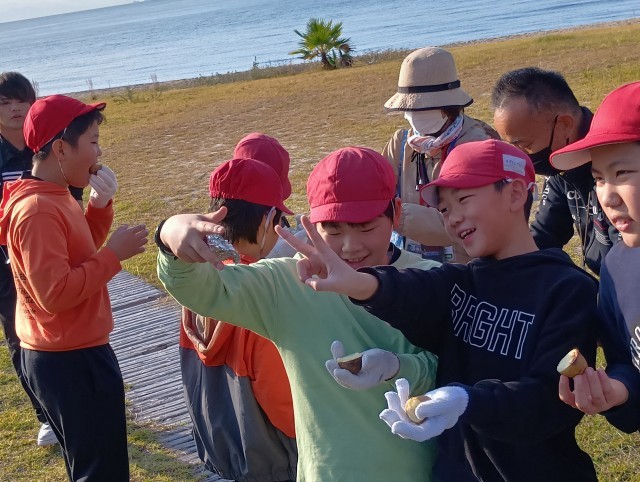 小屋の外では、塩の横で焼いたじゃがいもに、藻塩をつけて食べています。普通の塩と違って味わいがあり、おいしいです。子どもたちも「一生食べていられる!」という叫びが聞こえてきました。