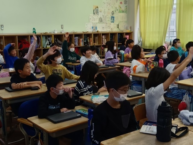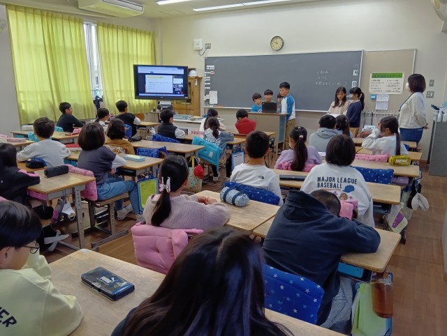 4年生は、班ごとに「祭り」について調べたことを、和歌山県の小学校と一緒に紹介し合っています。お互いに発表し合ううちに仲良くなって、最後の方には名前も覚えるくらいに打ち解けていたそうです。このあと、一緒におあのお祭りを作っていく予定なのです。たのしみですね。