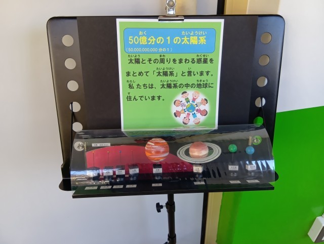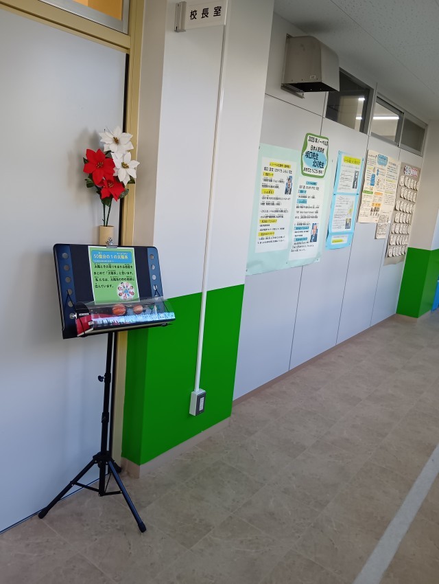 校長室の前に、50億分の1の太陽系の模型を置いています。これは、私が理科の研修会に参加した時に、講師の先生からいただいたものです。すごく良くできています。ありがとうございました!