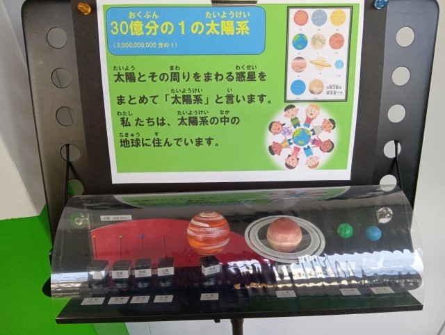 校長室の前に、30億分の1の太陽系の模型を置いています。これは、私が理科の研修会に参加した時に、講師の先生からいただいたものです。すごく良くできています。ありがとうございました!