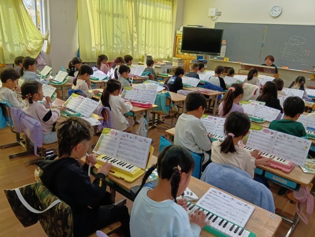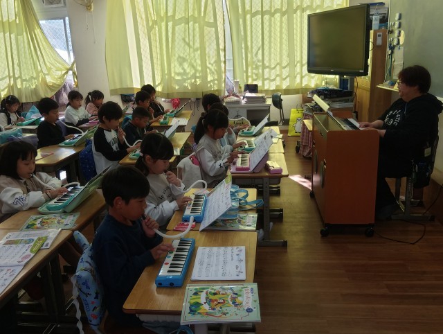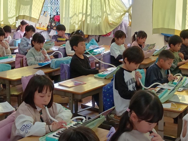 鍵盤ハーモニカで「メヌエット」を演奏しています。先生が下のパート、みんなは上のパートで吹いていますが、先生が「ちょっと、速い人がいるよ?ちゃんと合わせてみよう?」と言って、もう一度やると、メロディーと伴奏がうまくかみ合いました。「ほら、きれいやろ〜?」「うん!」「じゃぁ、もう一回やろう。」♫〜