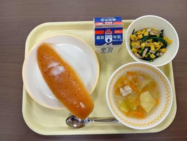 献立は、コーンソテー、野菜スープ、あげパン、牛乳 です。