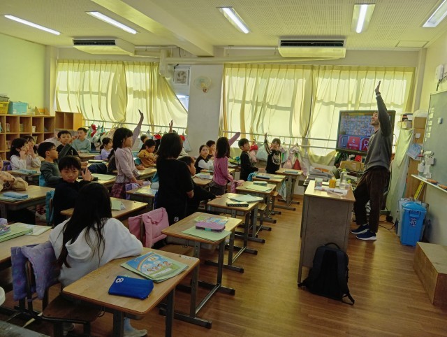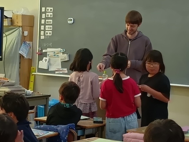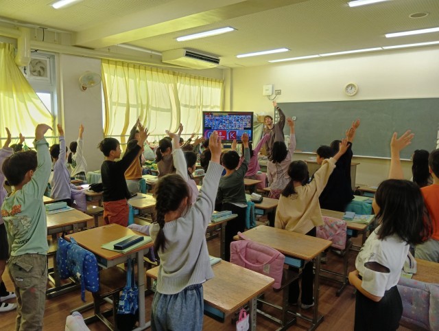 英語の単語を聞き取って、その子音を当てるゲームです。みんないつしようかですね。正解したら大きくバンザイして喜んでいます。ご褒美のステッカーを集めてご満悦の人もいました。楽しく英語に触れる機会が多いのはいいことてすね!