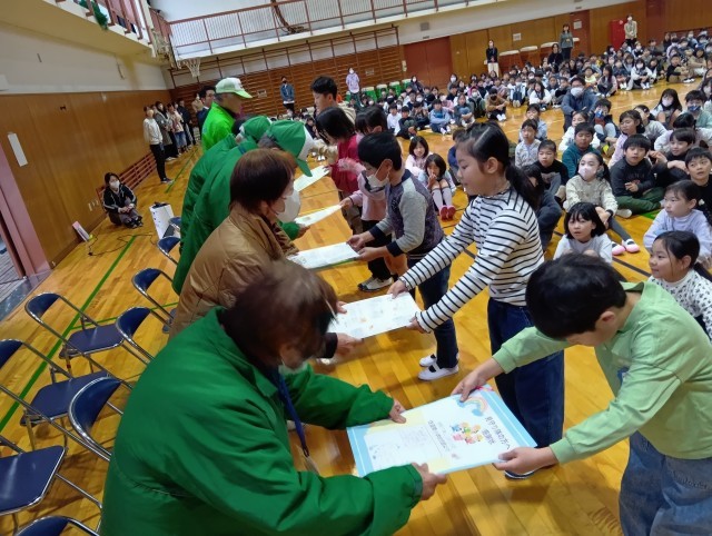 まず、みんなで感謝状をお渡しして、「ありがとうの花」を歌って聞いていただきました。そのあと、5年生の歌と合奏も披露しました。感謝の気持ちがうまく伝わったかな?