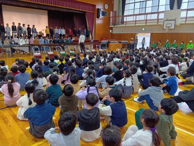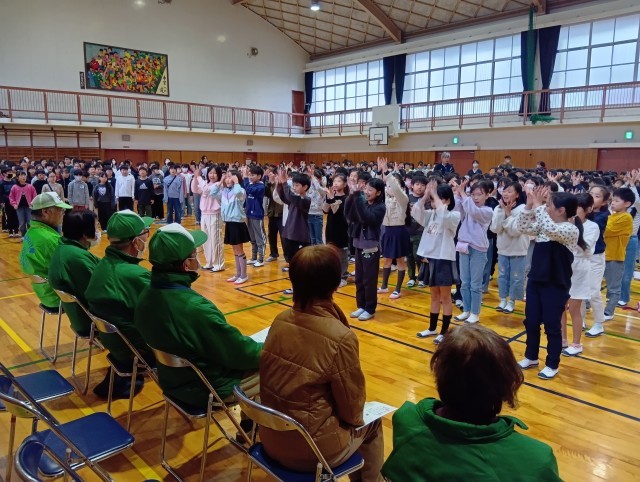 今日は、毎日子どもたちの安全のために登下校中の安全見守りをしてくださっている「子ども安全見守り隊」の皆さんに感謝する会を開きました。去年度までは2月に実施していましたが、その頃は寒さが厳しいということもあるので、この時期にして、5年生が連合音楽会で演奏する予定の曲を聞いていただくことにしました。
