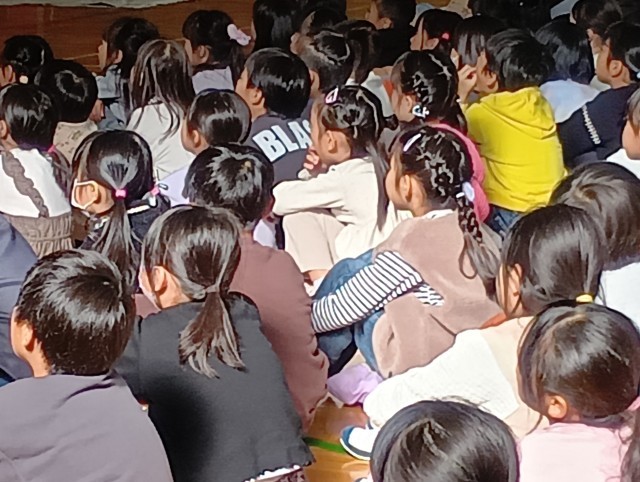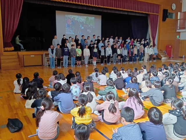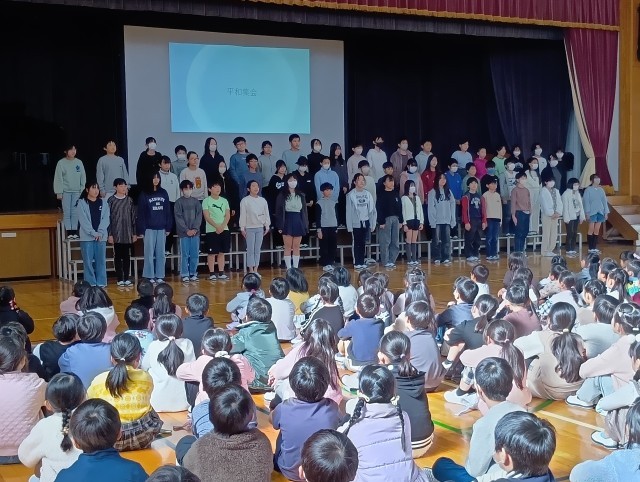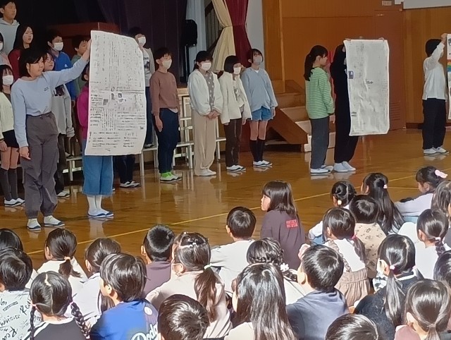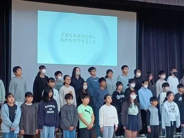 6年生が修学旅行で学んだことを全校児童に訴えかける「平和集会」が開かれました。平和学習のために作った平和新聞、セレモニーで歌った「折り鶴」の歌、修学旅行での取組みと学んだことをみんなで分担して紹介してくれました。素晴らしかったです。ありがとう、6年生の皆さん。