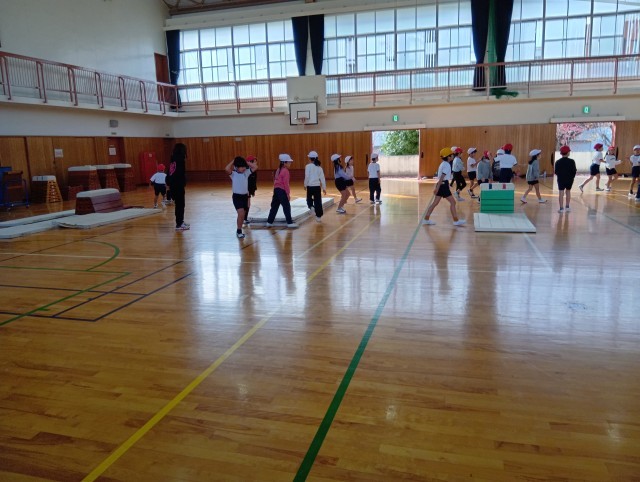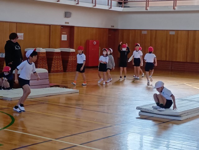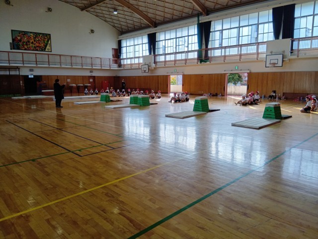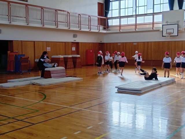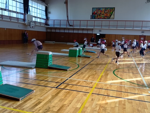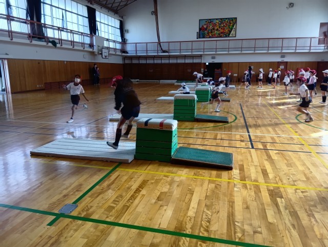 体育館では2年生がマット運動をしています。跳び箱なども自分たちで準備して、先生の説明を聞いて、練習開始。前転、台上前転、跳び箱など、いろんな種目がありますが、みんな楽しそうに取り組んでいました。
