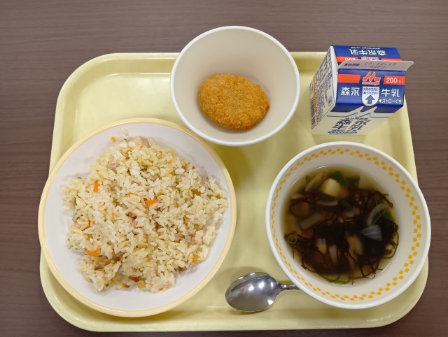 献立は、やきめし、もずくスープ、ブリキャベカツ、牛乳 です。やきめしももずくスープもおいしかった。ブリキャベカツは新メニューです。ブリのメンチカツのようなもので、ブリの美味しさを楽しめました。これ、市販されてたら買うのになぁ。ごちそうさま。