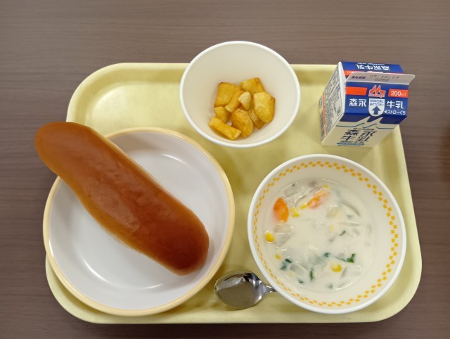 献立は、カブのクリーム煮、黒糖パン、フライドポテト、牛乳 です。