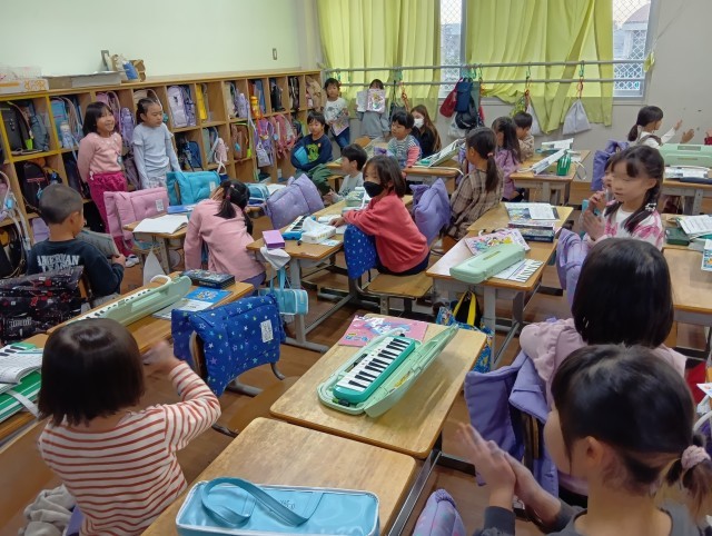 1-1の教室では、2人ずつで「おもちゃのチャチャチャ」の歌を歌って、他の人はそれに合わせて手をたたいていましま。