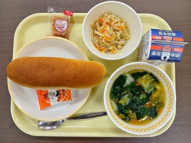 献立は、白菜と肉だんごのスープ、切り干し大根サラダ、ごまドレッシング、コッペパン、ミルククリーム、牛乳 です。スープには、白菜たっぷりでボリュームがありました。切り干し大根にはツナ肉も入っています。ミルククリームは、ついているとうれしい。ごちそうさま。