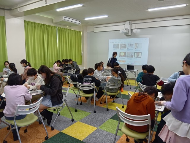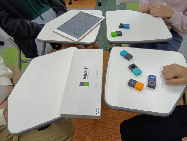 アクティブ教室から楽しそうな声が聞こえてきました。中では子どもたちが、ワイヤレスで IoTのシステムを作って学べるブロック型の教材を使ってプログラミング学習をしているところでした。人が近くを通ると反応するとか、周りが暗くなると反応するなどのセンサーや、音が鳴るとか明かりがつくなどの部品があって、それをPCでプログラミングして思い通りに動く装置が作れるというものです。ワイヤレスというのが、使い勝手がよさそうです。