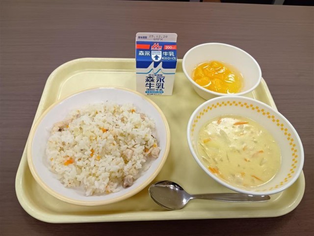 献立は、ポタージュスープ、チキンピラフ、ももカクテル、牛乳 でした。