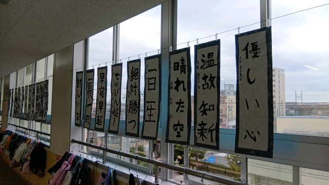 先週の書き初めの作品が、さっそく廊下にずらりと掲示されています。個性的な決意もいくつかあったりして、面白いです。今年がいい年でありますように!