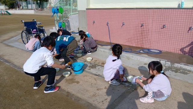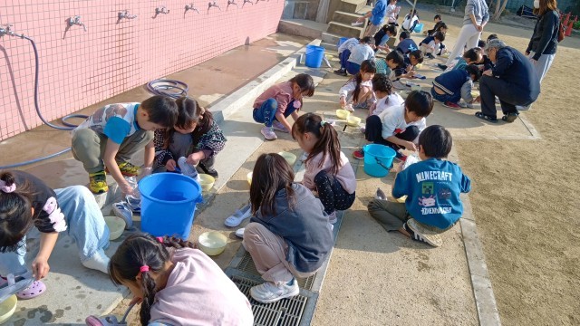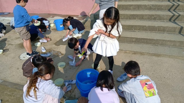 運動場で何かしてるな?と思って見ると、みんな上靴(体育館用かな?)を洗っています。