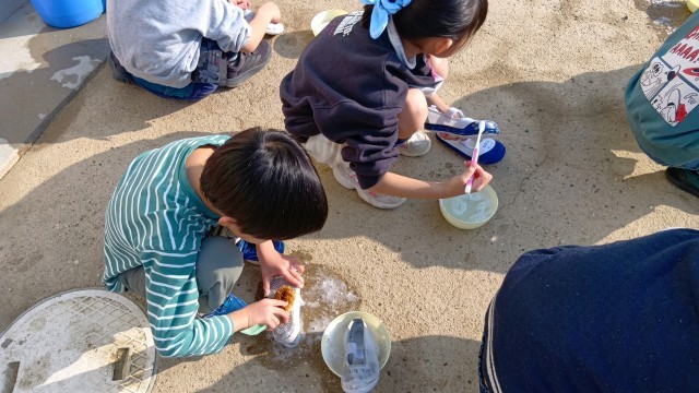 洗剤を付けてブラシでこすると白くなっていくのがおもしろくて「ずっと洗っていたい」と言っていた子もいたとか。
