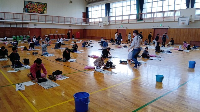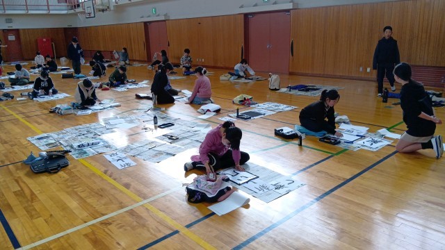 「新しい風」を練習してから大きな紙に書きます。大きな紙に毛筆で書くのは、初めての人が多いんじゃないかな?みんな真剣に注意深く筆を運んでいました。