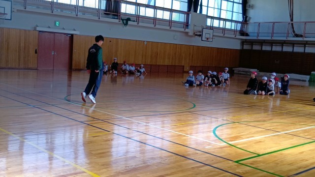 3ー2の体育の授業では、中学生の人にお手本を見せてもらってリズムジャンプの練習をしています。3-1では理科の授業で、中学生の人といっしょに磁石の教材の準備をしています。