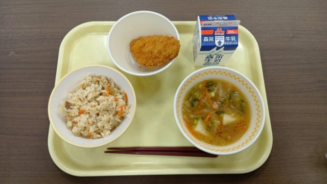 献立は、あじのフライ、切り干し大根ごはん、みそ汁、牛乳 です。