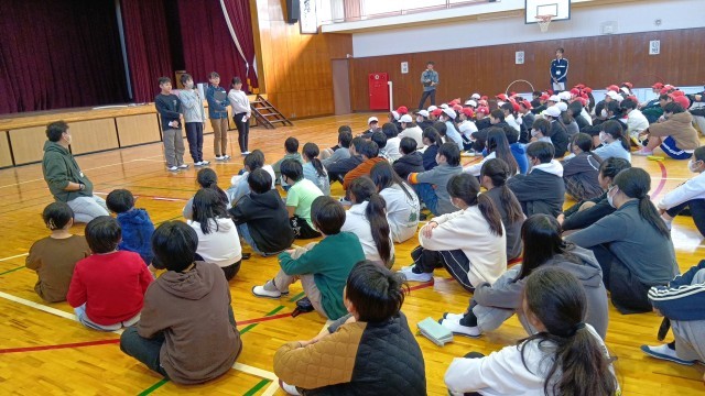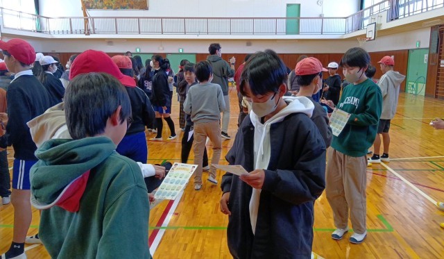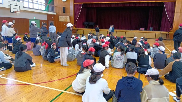 児童会の子が、全体の前でマイクを持ってゲームを進める場面もありました。みんな、はじめはちょっと遠慮がちでしたが、途中からは笑顔が見られ、拍手や笑い声が聞こえてきました。