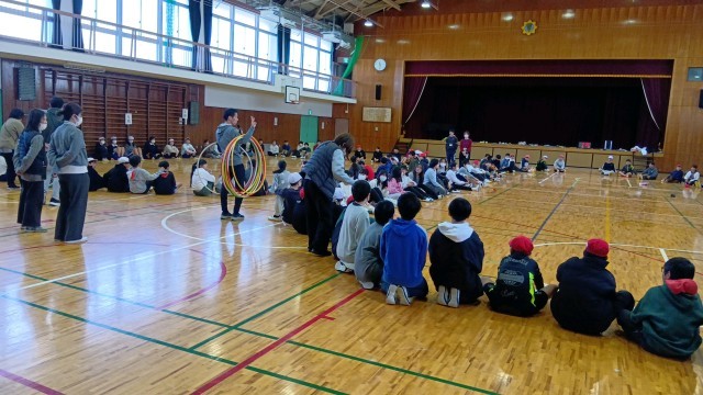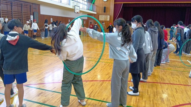 自分と違う学校の子に質問する「おさんぽビンゴ」や手をつないだままでフラフープを回していく「フープリレー」などをして楽しみました。