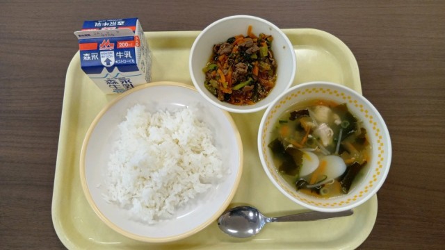 献立は、ビビンバ、わかめトック、ごはん、牛乳です。