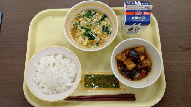 献立は、かきたま汁、さばのソース煮、ごはん、のり、牛乳 です。