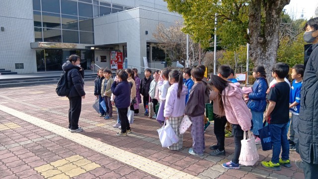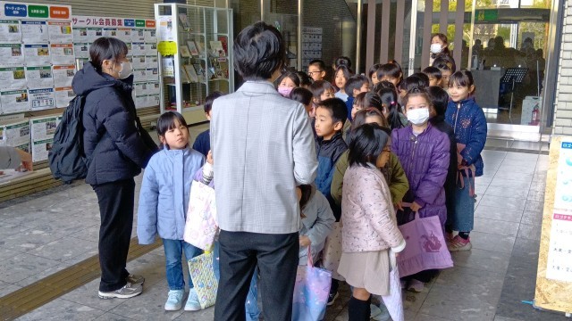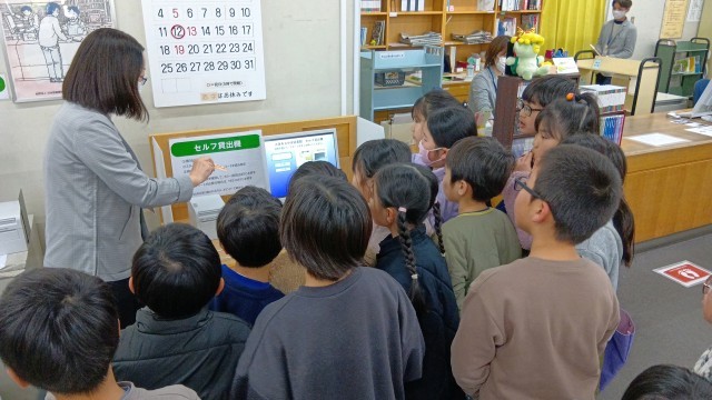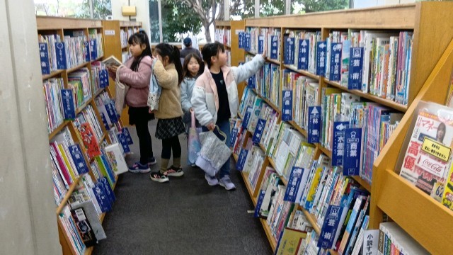 2組は3時間目、1組は4時間目に中央図書館へ行って、司書の方に館内を案内していただきました。セルフ貸出機や移動図書館の説明を聞いたり、返却BOXの裏側やバックヤードの書庫などの普段は入れないところへ入らせてもらったりして、こどもたちも大喜びでした。最後に1人3冊ずつの本を選んで借りて帰りました。学校から図書館まで5分というのがうれしいですね。