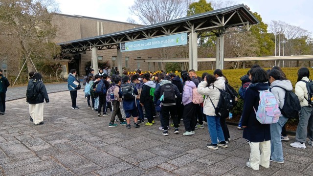 バスレクのクイズや合唱しながら楽しい道中の後、予定通り琵琶湖博物館に到着しました。