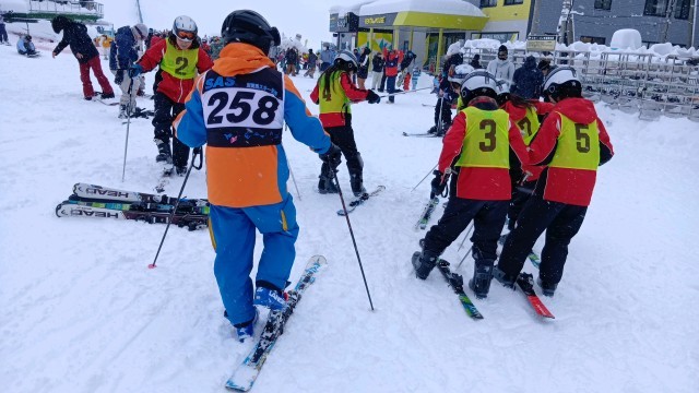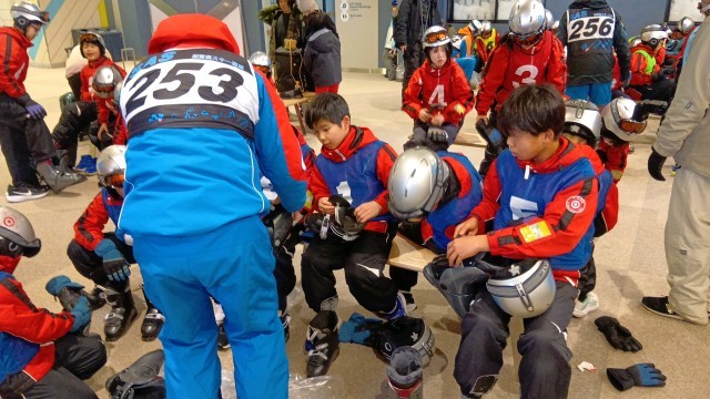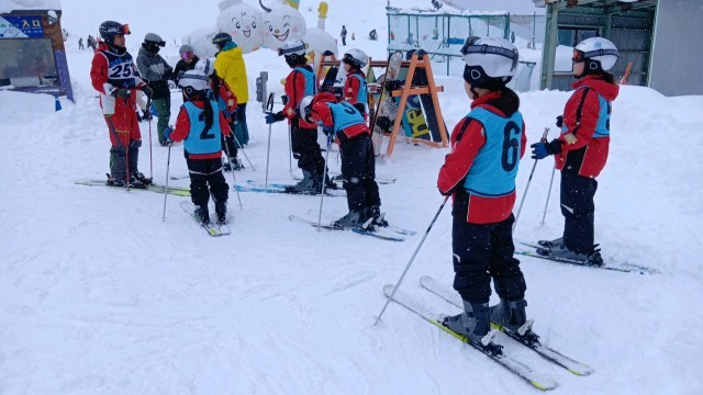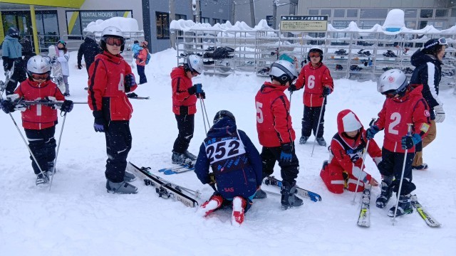 9つのグループに分かれ、インストラクターさんに、まずはスキーシューズを履くところから教わります。そして、雪の上でスキーを装着します。自分のことは自分でしなくてはいけないので、みんな必死です。