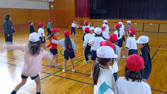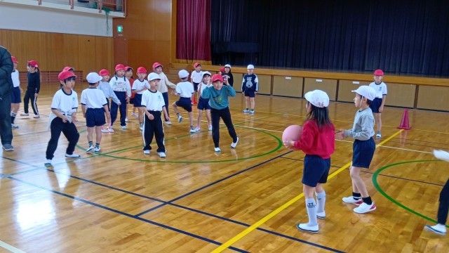 体育館でドッジボールをしています。ボールがこわくて逃げている子もいるけど、やわらかいボールなので大丈夫です。「えいやっ」とボールを投げると、みんな歓声をあげて一斉に走って逃げます。
