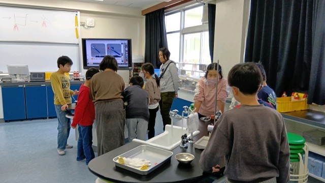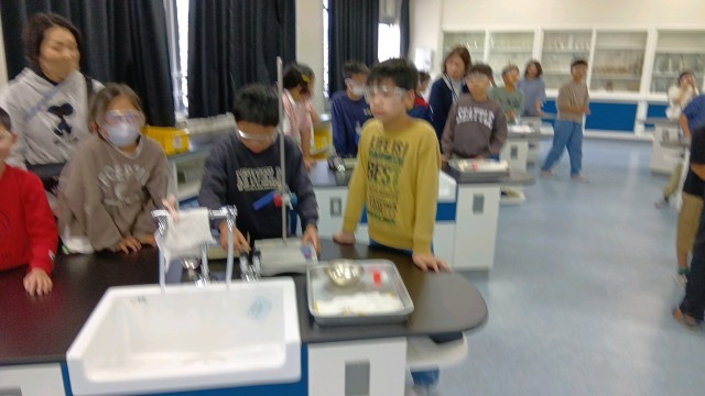 理科室で実験をしています。なんで絵の具を入れてるのかな?と思ったら、「サーモカラー」といって、温度が上がると色が変わるんだそうです。それはおもしろそう!