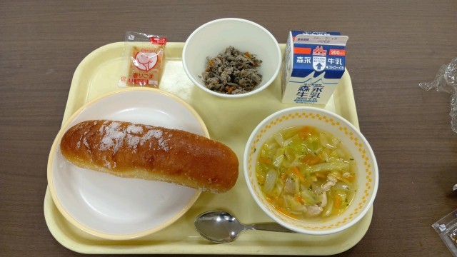 2/5の献立は、野菜のスープ、ごぼうサラダ、ごまドレッシング、揚げパン、牛乳 です。
