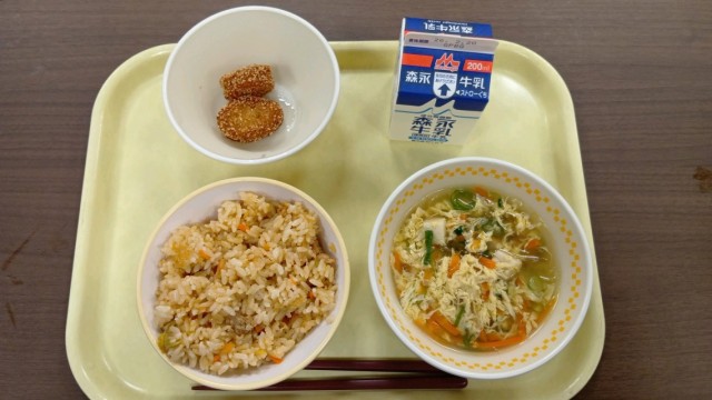 献立は、豚キムチごはん、五目卵スープ、米粉魚ナゲット、牛乳です。
