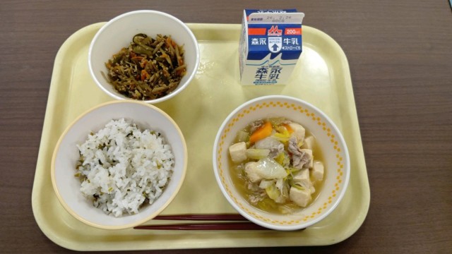 献立は、やっこ煮、茎わかめのきんぴら、菜めし、牛乳 です。