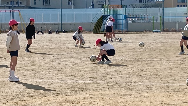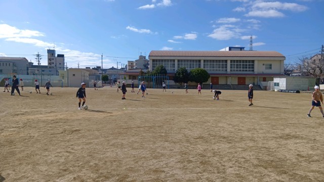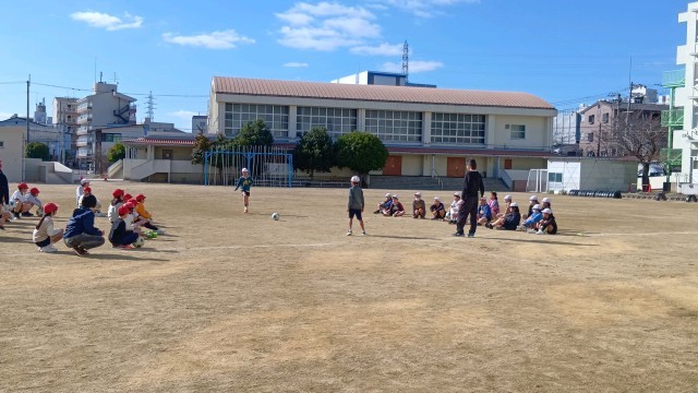 春のような日差しですがまだまだ風は肌寒く感じます。運動場でサッカーのパスの練習をする子どもたちは元気ですね。得意な子たちがお手本を見せる場面もありました。