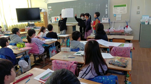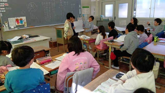 好きな教科など、グループで興味のあることを調べたようです。「次、発表できる班ありますか?」と先生が聞くと、「はい、はい」と手が上がっていました。