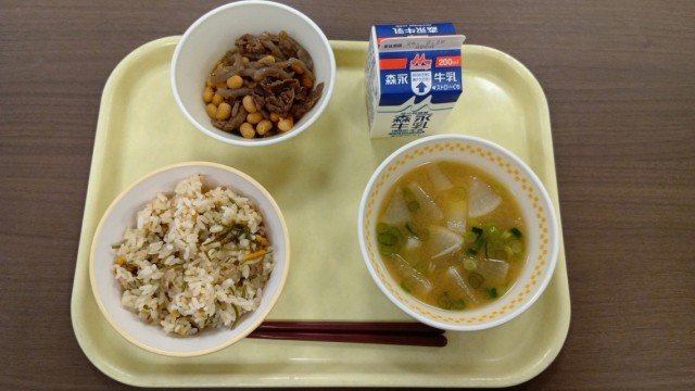 献立は、クファジューシー、五目豆、みそ汁、牛乳 です。