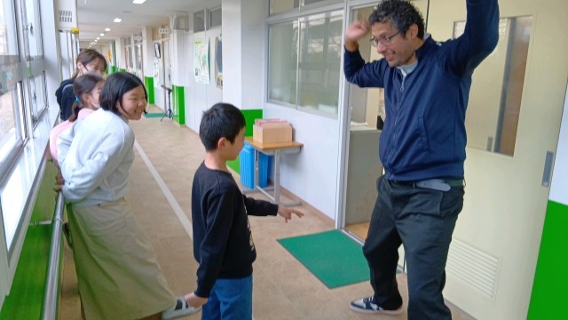 本校には毎週金曜日に来て英語を教えてくれるAETの先生が2人いて、普通は交互に1人ずつ来てくれます。でも、今日はたまたま二人とも来てくれることになっていました。さっき5年生の教室で授業をしていたAETの先生とは別の先生が休み時間に廊下で英語でじゃんけんをしていました。