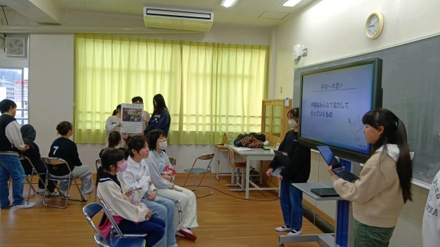 6年生は大きな創作物も使って平和学習のプレゼンをしていました。平和への思いを一生懸命形にして伝えようと頑張っていました。