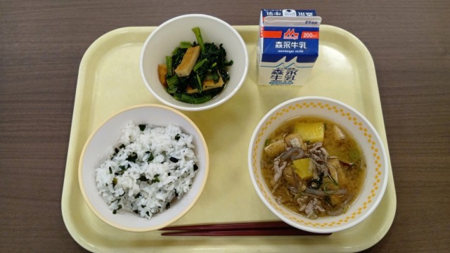 献立は、豚汁、小松菜と平天の煮びたし、わかめごはん、牛乳 です。