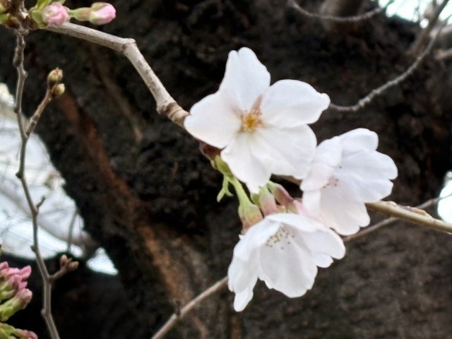 今朝、西門の近くにある桜の木に花が咲いているのを見つけました。