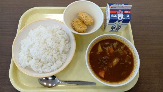 カレーシチュー、ごはん、チキンナゲット、そして牛乳です。