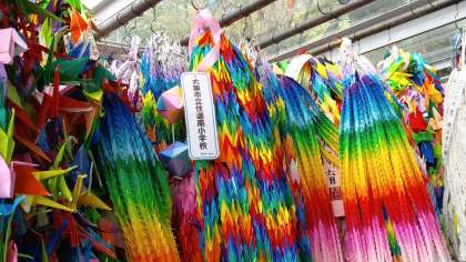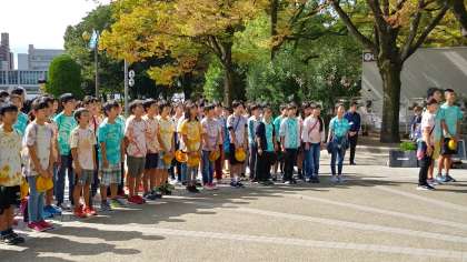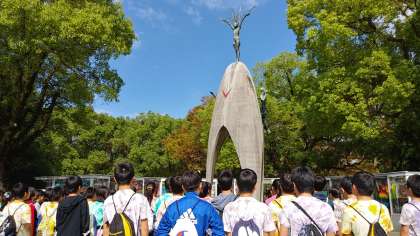 原爆の子の像の前で、平和セレモニーを行いました。黙祷のあと、住道南小学校の児童の願いを込めた千羽鶴を捧げました。「広島のある国で」を全員合唱したあと、誓いの言葉を述べました。心引き締まる思いがしました。
