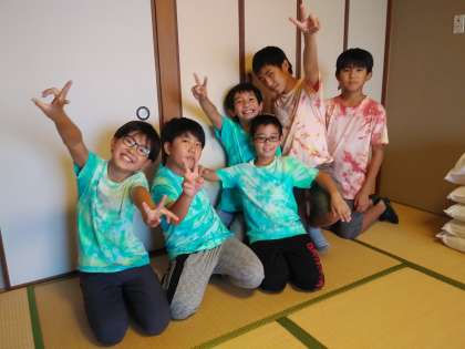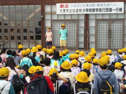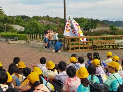 無事、県民の浜「輝きの館」に到着しました。瀬戸内海の穏やかな空気に包まれて、とてもいいところです。歓迎の横断幕とスタッフの方に迎えられて、入館式を行いました。学年の旗も作って掲揚しました。一泊二日、みんなと過ごすのが楽しみです。