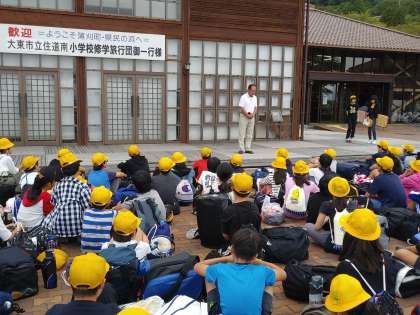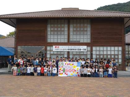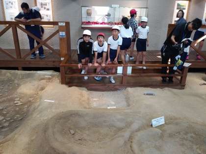 輝きの館といよいよお別れです。藻塩づくりの歴史を学ぶ資料館もよかったです。退館式では、みんなで作った藻塩を土器と一緒にお土産としていただきました。最後に輝きの館前に掲げた住南小6年生の旗と共に記念写真を撮りました。楽しい思い出を本当にありがとうございました!