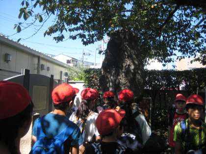 はじめに「つるのはし跡」という日本最古の橋の跡のある碑を見学しました。「鶴橋」の地名の淵源になる場所でした。
